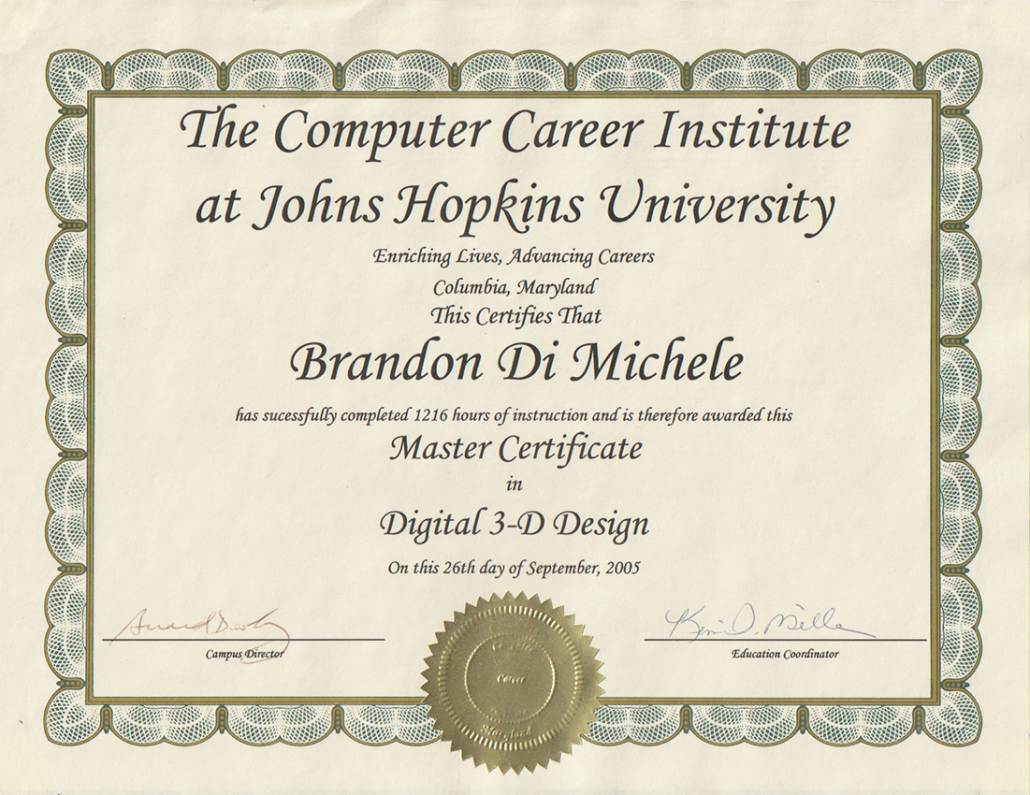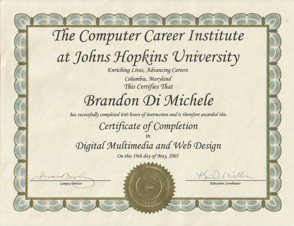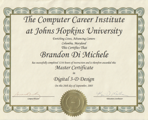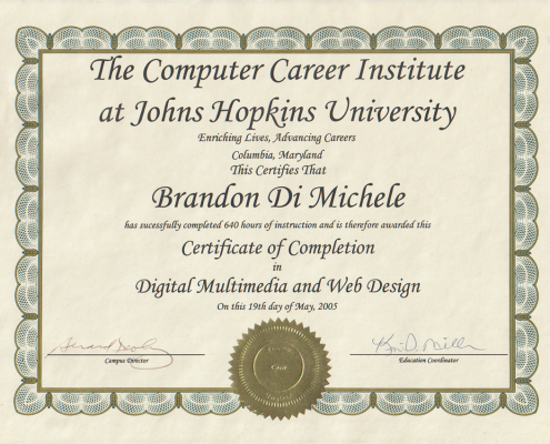 I graduated from Johns Hopkins University’s prestigious Computer Career Institute Master’s Degree level program in 2005 with a focus on the Creative Digital Multimedia technologies after having been accepted into the program based on my technological aptitude and recommendations from past teachers from my background as the Technology Advisor to the Worcester County Maryland Board of Education. The Computer Career Institute or CCI at JHU was a pioneering program put together by Johns Hopkins University as one of the first institutions to offer high level digital multimedia training and education recognizing the future need for these kinds of skill sets.